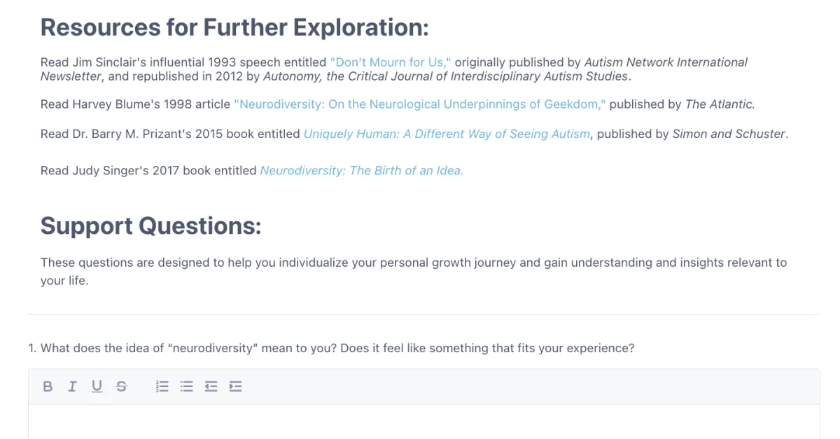 The videos create the foundation. From there, each client moves into their own integration work — with support questions, modalities, and reflection tools tailored specifically to their neurology and relational focus.
