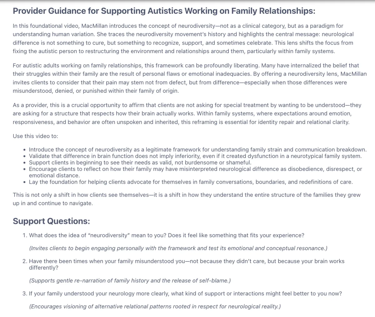 From there, your resources become tailored. Each video comes with a provider guide specific to your client's track and focus — giving you clinical context, session guidance, and support for how to process the material with that particular client in that particular relational context. The guide speaks directly to what an autistic client or a non-autistic client is likely to bring into the room after engaging with this content, and how to meet them there with precision and care.
