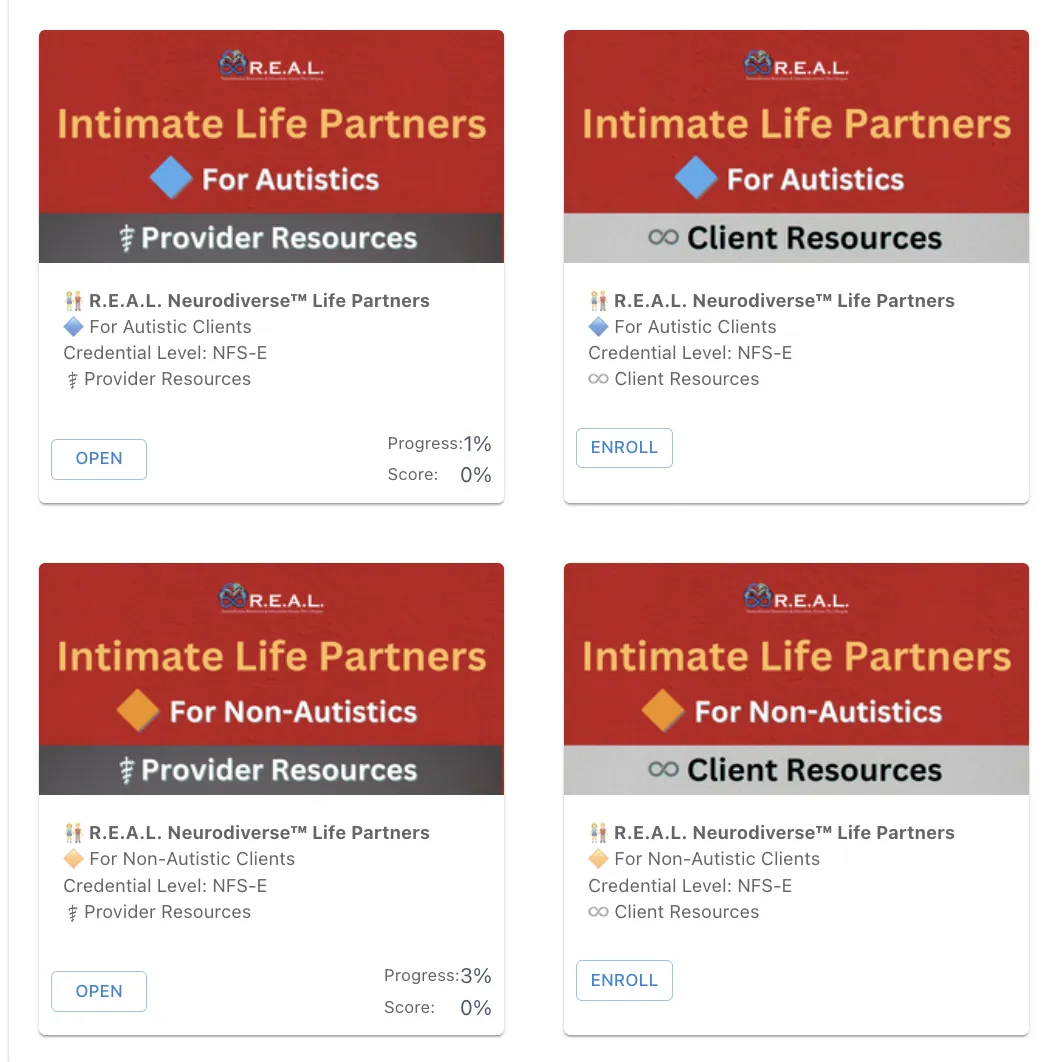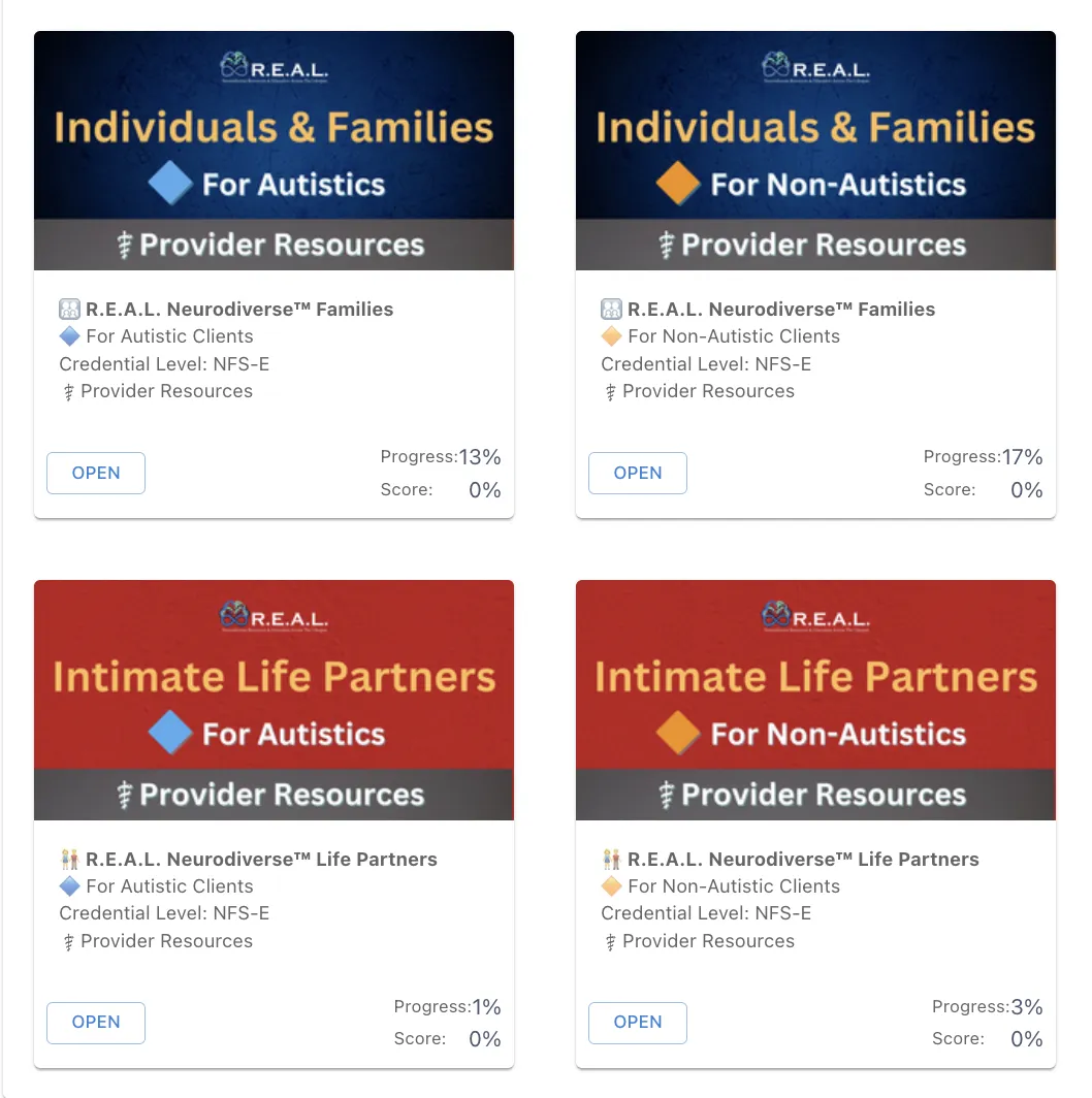 Clients begin with structured psychoeducational modules that build shared language and a neurodiversity-affirming foundation — with distinct autistic and non-autistic tracks, and separate family and life partnership focuses. Everyone starts from a place of understanding.