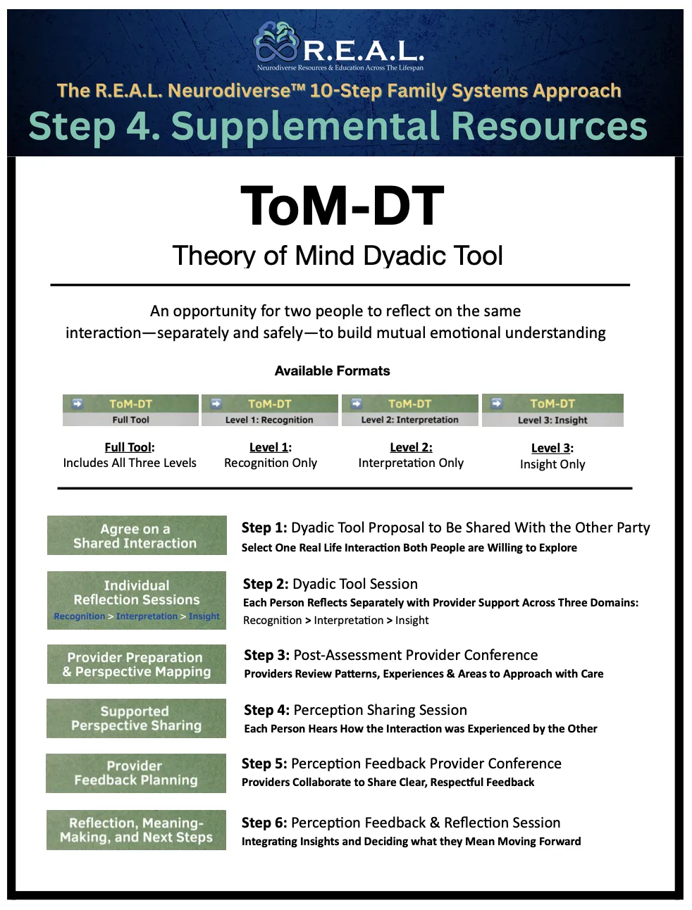 These tools are not a next step every provider will take — and they are not needed for the framework to be fully effective. Post-Step Integration Discussions remain the recommended first level of shared relational support for all providers. The ToM tools are simply available, when the time is right and the credential is in place, for those who are ready to go further.